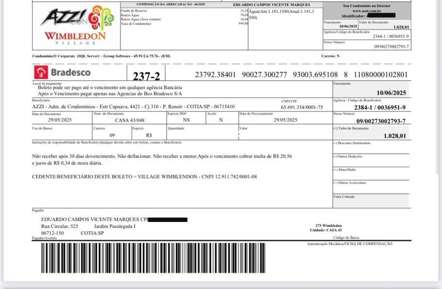- Valor do condomínio (Mai/25): R$ 1.028,01 / mês