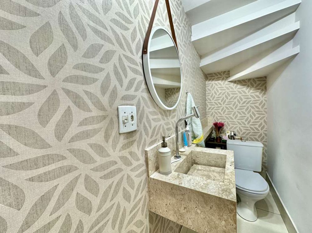 - Banheiro com pia em granito, gabinete e box de vidro.