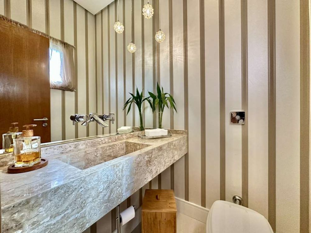 • Banheiros decorados com painéis, tampos white prime, espelhos, gabinetes, box de vidro e nichos. Sendo a master com 2 cubas e 2 duchas.