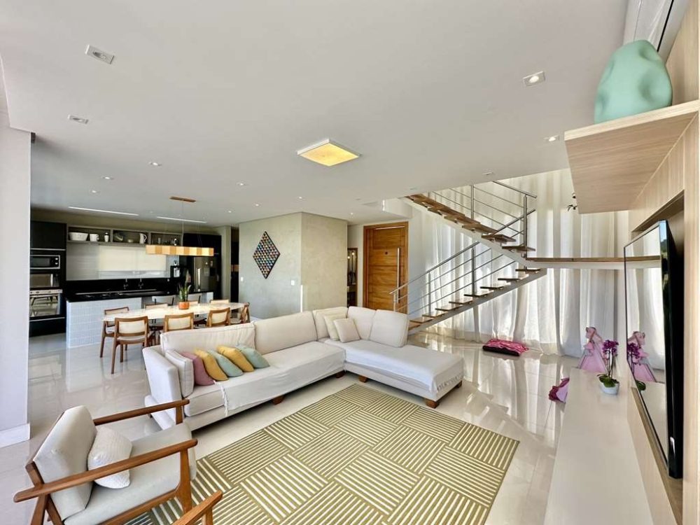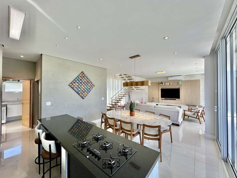• Living para 6 ambientes integrados, com ar-condicionado Q e F e uma parede em canjiquinha, voltado para varanda Gourmet