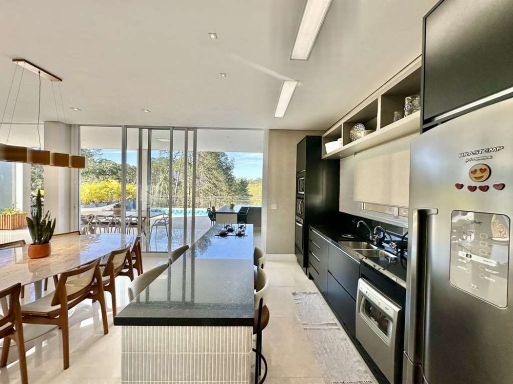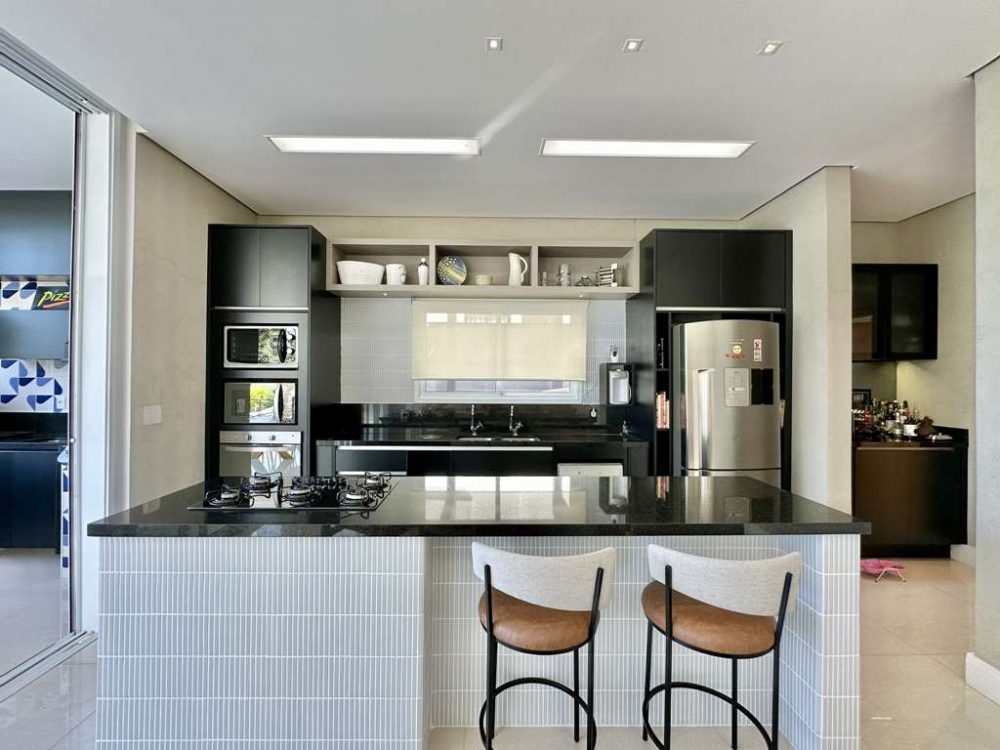 • Cozinha planejada com despensa, prateleiras e porta de correr, bancada em granito, 2 cubas inox com 2 torneiras, balcão para 4 bancos, bancadas e gabinetes. Fogão Brastemp Ative 5 bocas cook top e forno Brastemp.