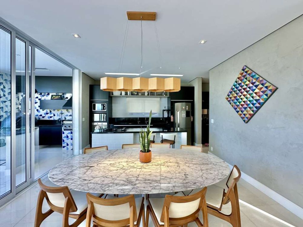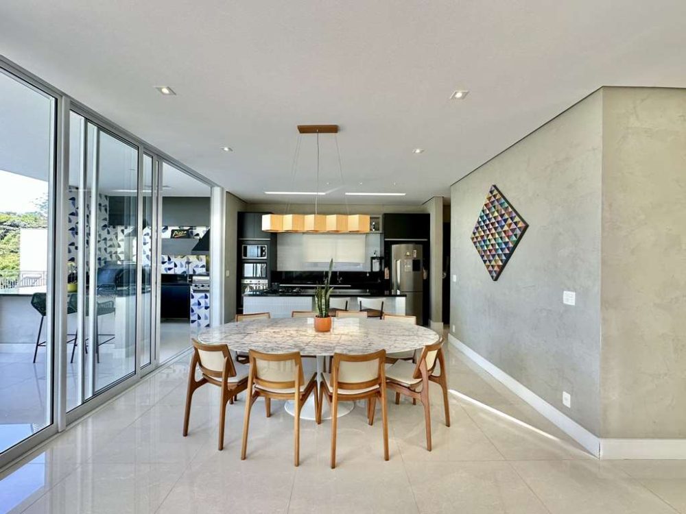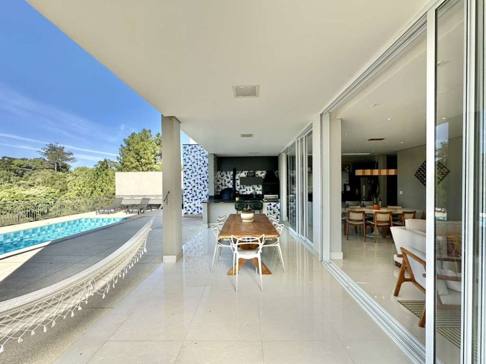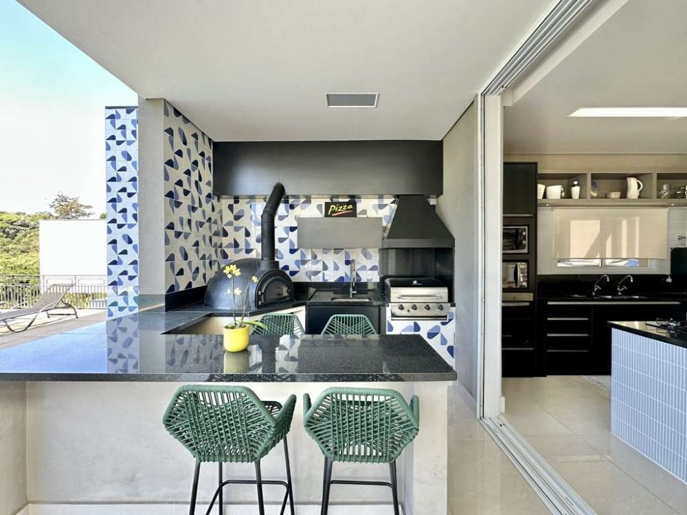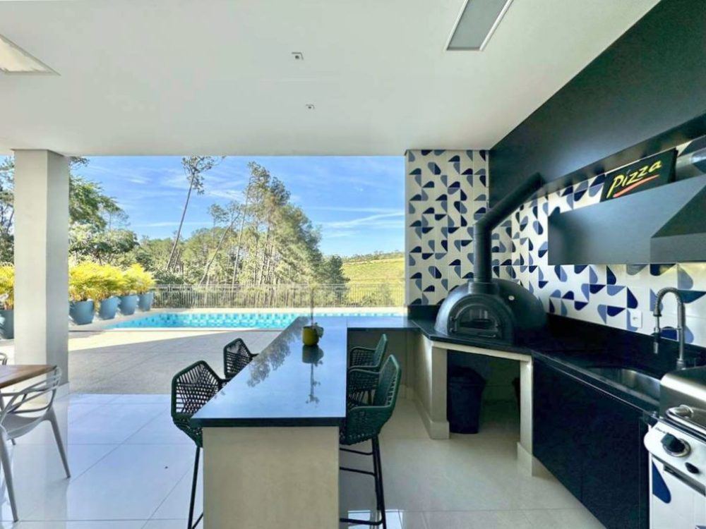 • Varanda Gourmet integrada, voltada para piscina, com privacidade e vista. Forno de pizza, churrasqueira a gás Cher Broil, coifa, bancada, balcão em granito, cuba inox, torneira gourmet e gabinetes. Espaço para rede, estar e refeições com mesa para 8 acentos.