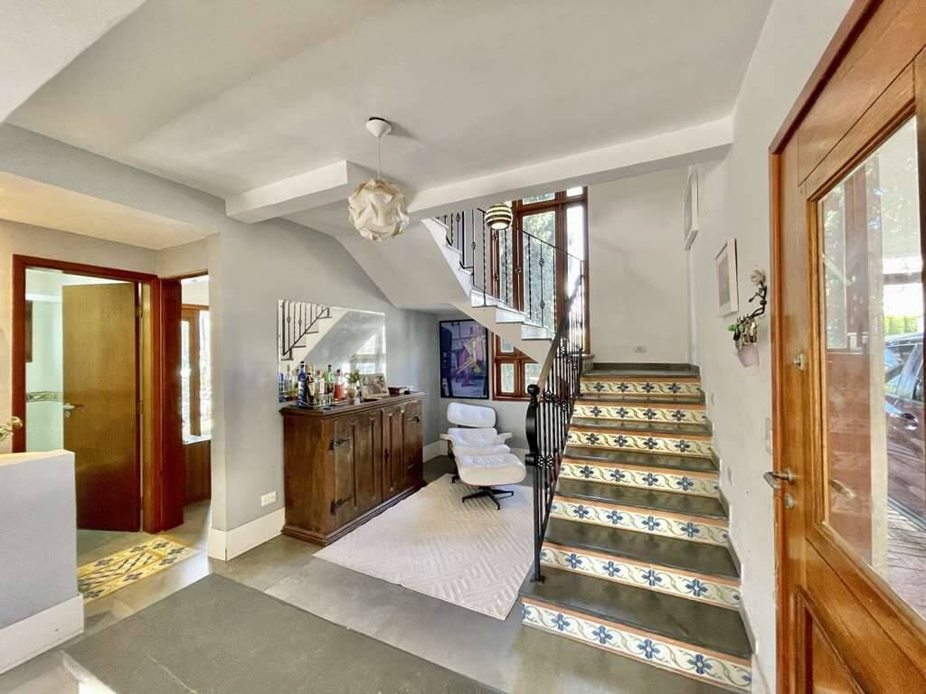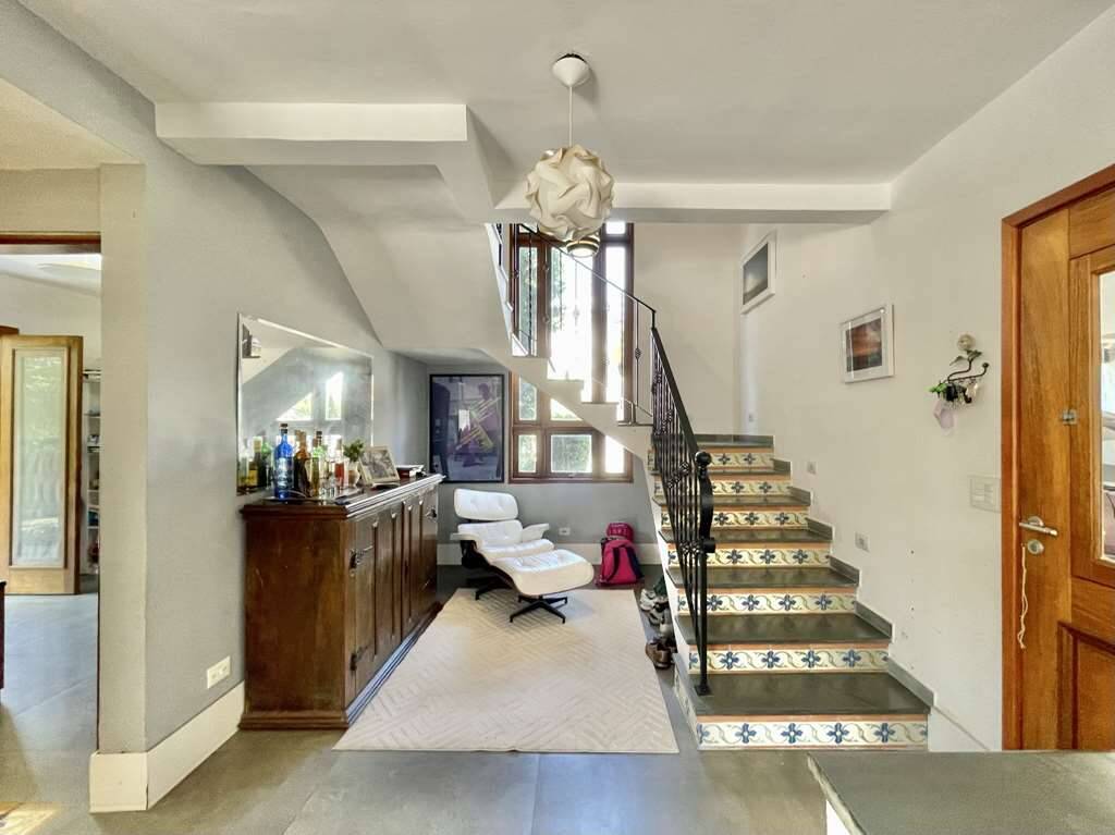- Escada de alvenaria revestida em ardósia com detalhes em cerâmica e guarda corpo em ferro forjado.