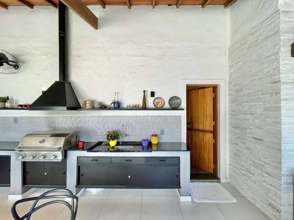 - VARANDA GOURMET / SALÃO DE FESTAS para 2 ambiente. Envidraçado, paredes com detalhes em cerâmica 3D, pedra Canjiquinha e portas de vidro de correr: com churrasqueira à gás Home e Grill, bancada em “L”, pia com cuba inox e gabinetes.