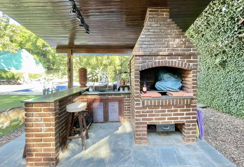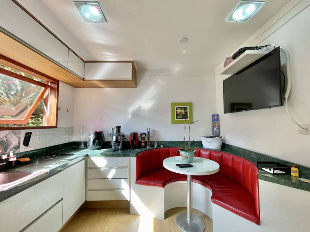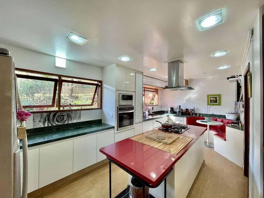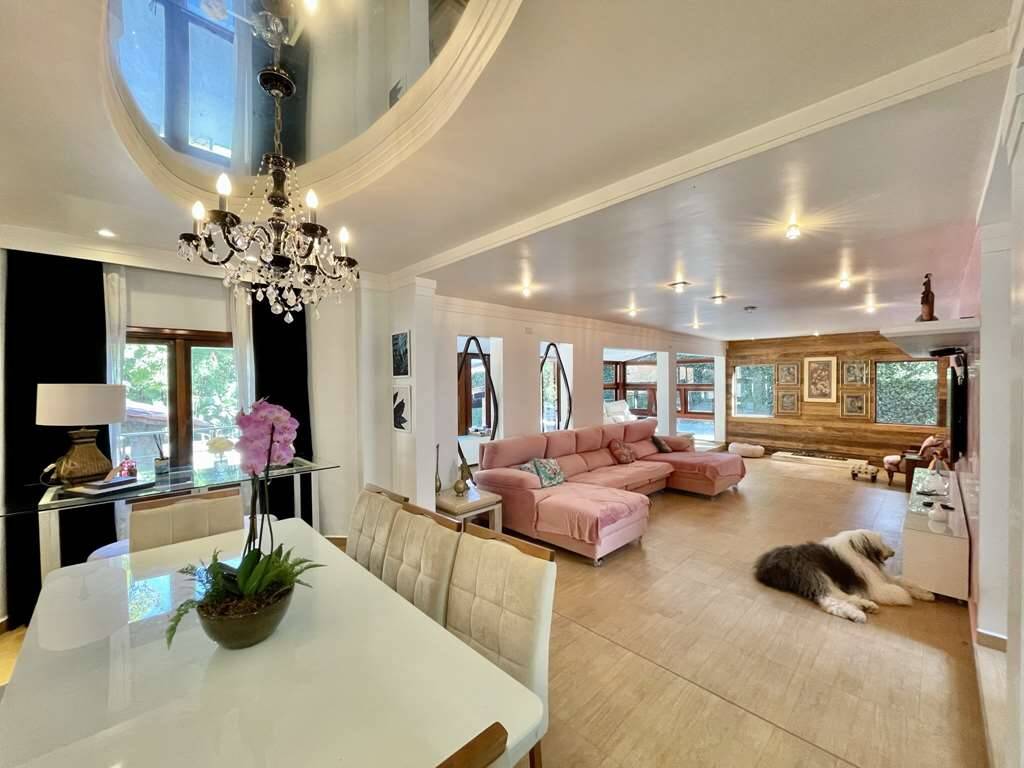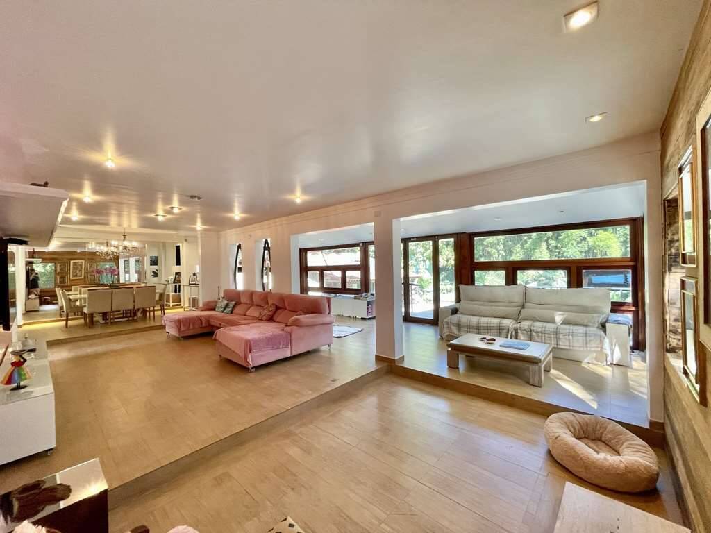 - 5 salas em conceito aberto com a cozinha em todo andar inferior, 2 destas com paredes de vidro e mogno e iluminação natural (jardim de inverno). Lareira interna a gás e externa à lenha. Painéis de madeira com acesso p/ manutenção de fiação embutida, 9 câmeras de segurança, alarme e internet.