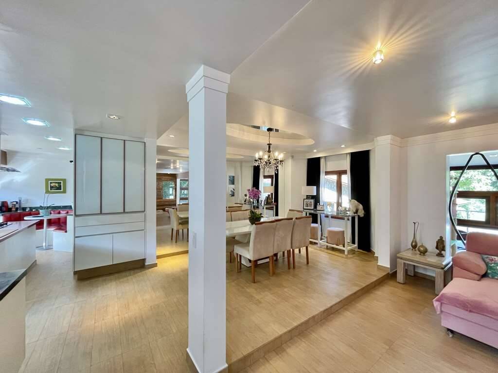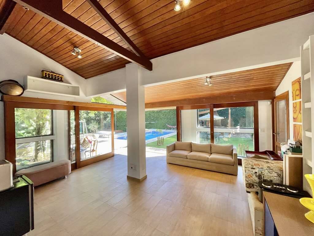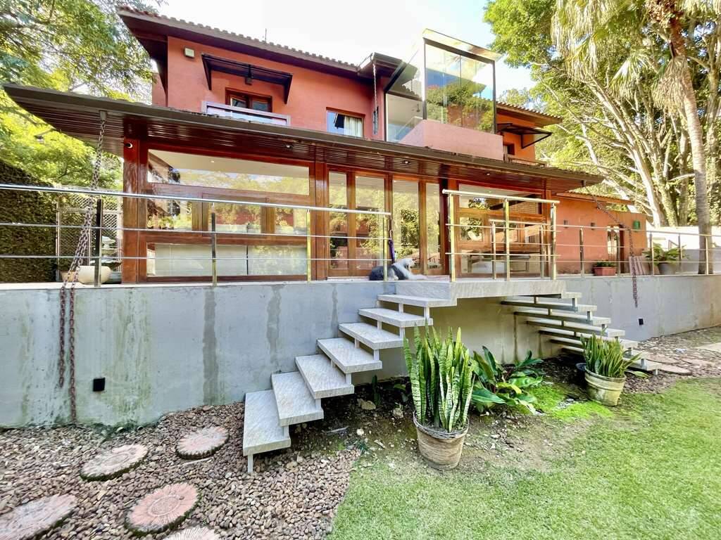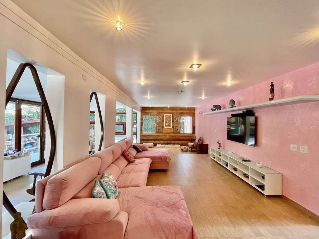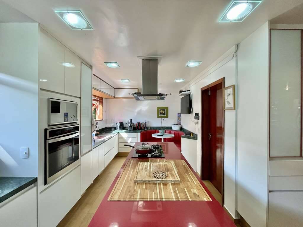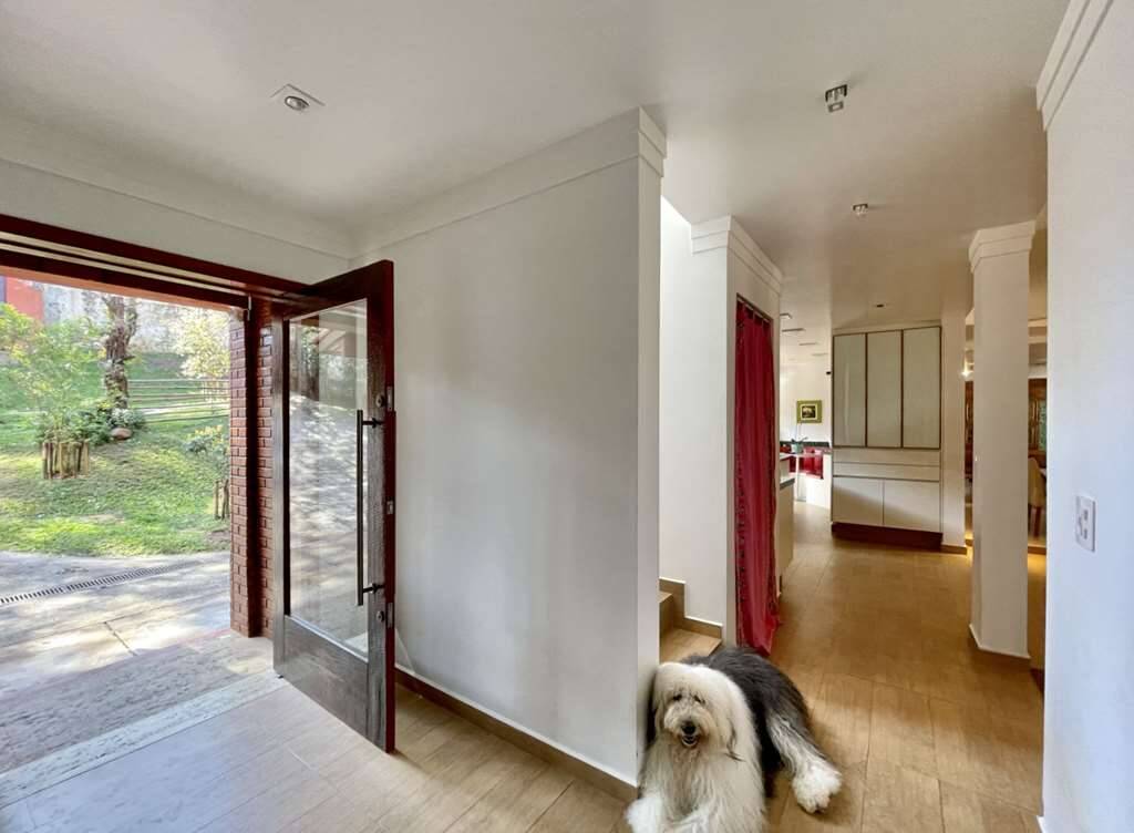 - 5 salas em conceito aberto com a cozinha em todo andar inferior, 2 destas com paredes de vidro e mogno e iluminação natural (jardim de inverno). Lareira interna a gás e externa à lenha. Painéis de madeira com acesso p/ manutenção de fiação embutida, 9 câmeras de segurança, alarme e internet.