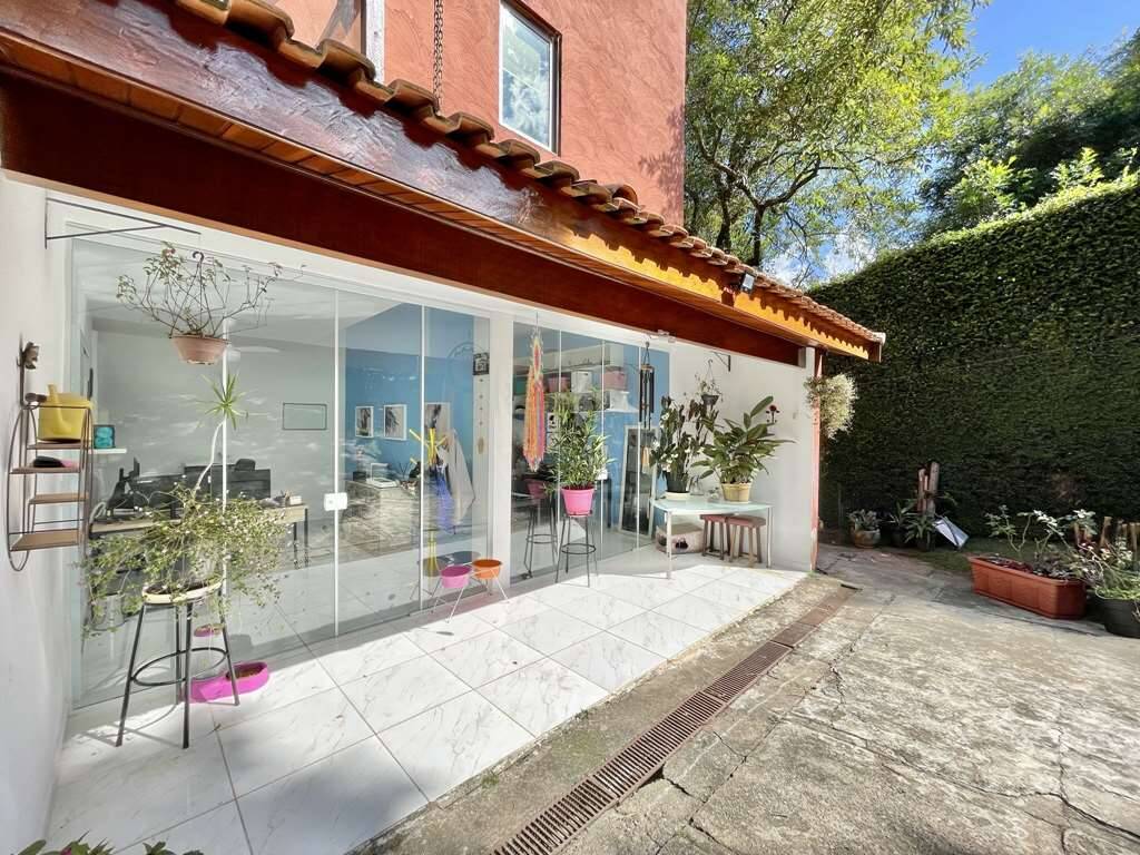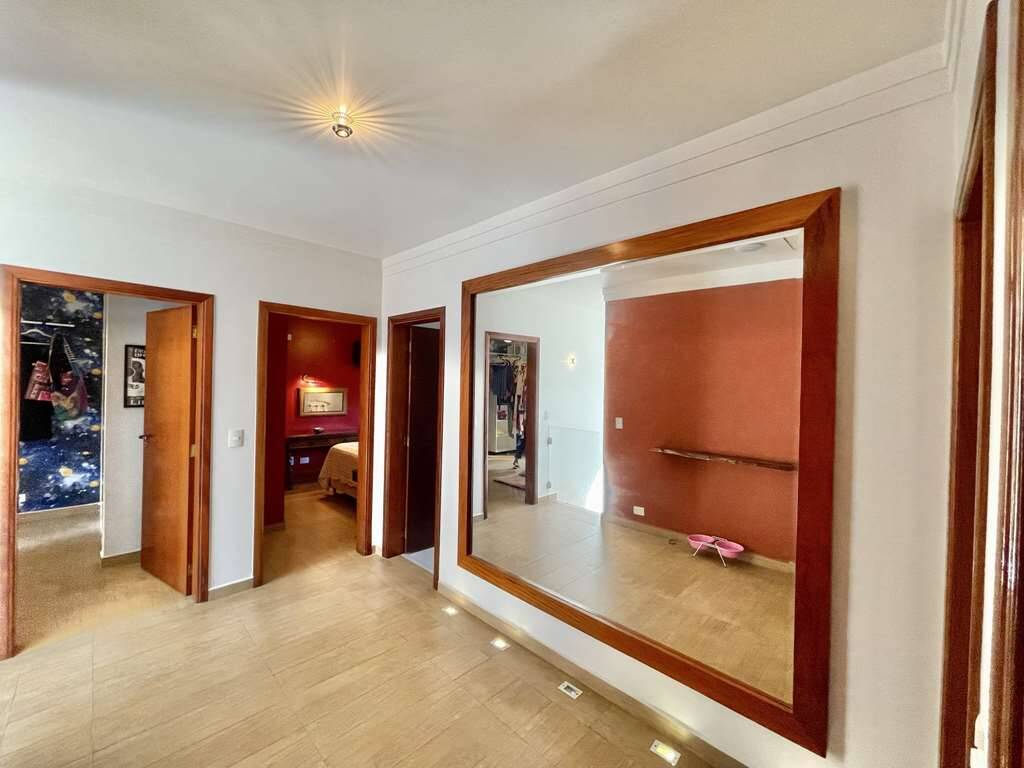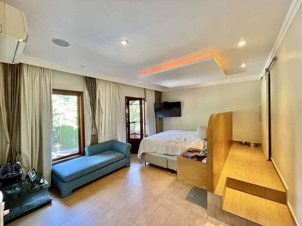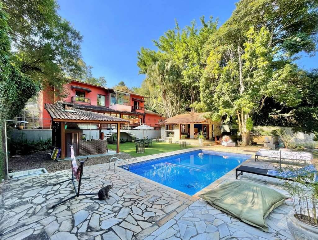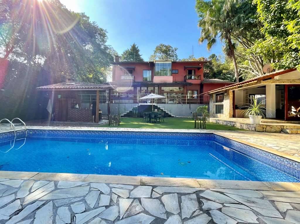 - 5 salas em conceito aberto com a cozinha em todo andar inferior, 2 destas com paredes de vidro e mogno e iluminação natural (jardim de inverno). Lareira interna a gás e externa à lenha. Painéis de madeira com acesso p/ manutenção de fiação embutida, 9 câmeras de segurança, alarme e internet.