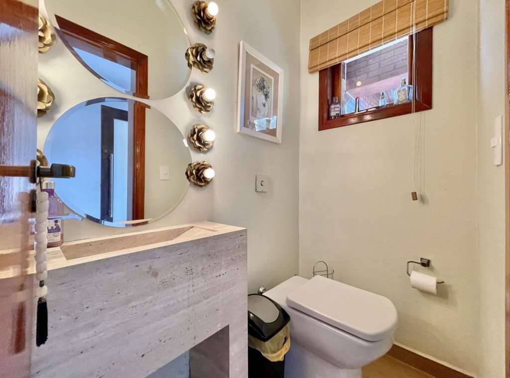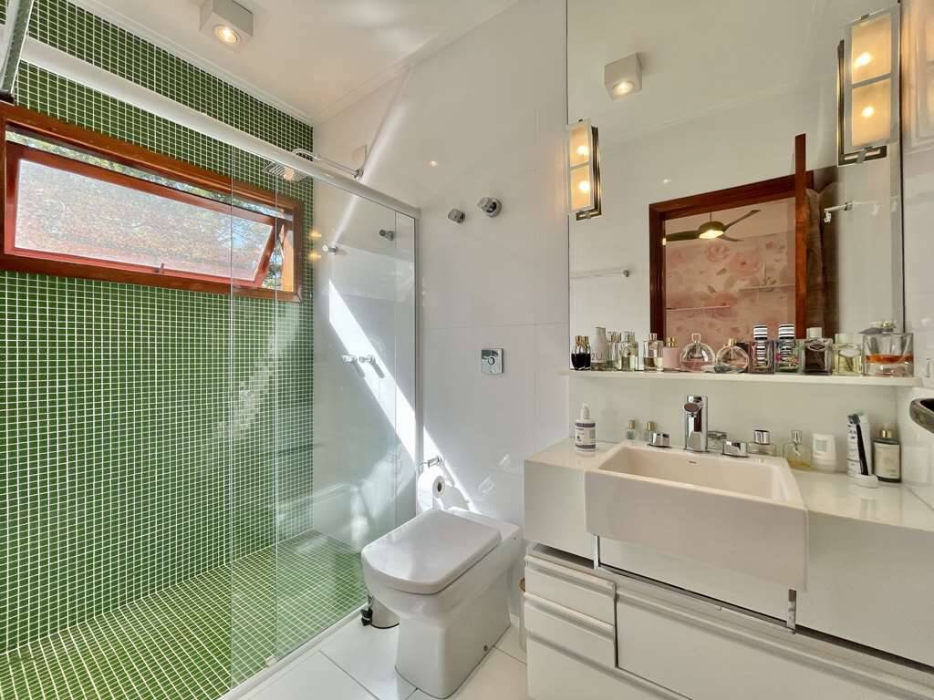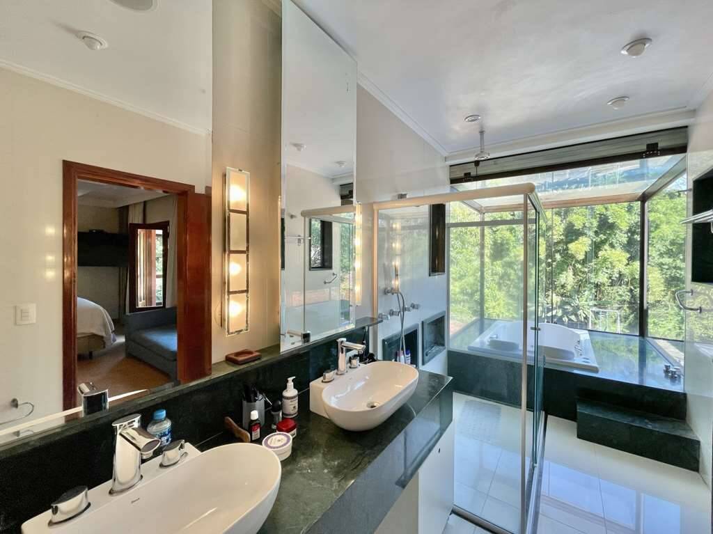 - Sobrado com 4 dormitórios (2 suítes) com sacadas em cruzeta e vidro, sendo a suíte Master com ar-condicionado/aquecedor, W.C. com magnífica banheira de hidromassagem para casal em cabine de vidro e mármore que sai sobre o telhado (único e divino), pia dupla em bancada de mármore, chuveiro duplo em box de vidro, closet gigantesco! Os outros W.C.s são com bancadas de MarmoGlass e pia de mármore Travertino romano no lavabo.