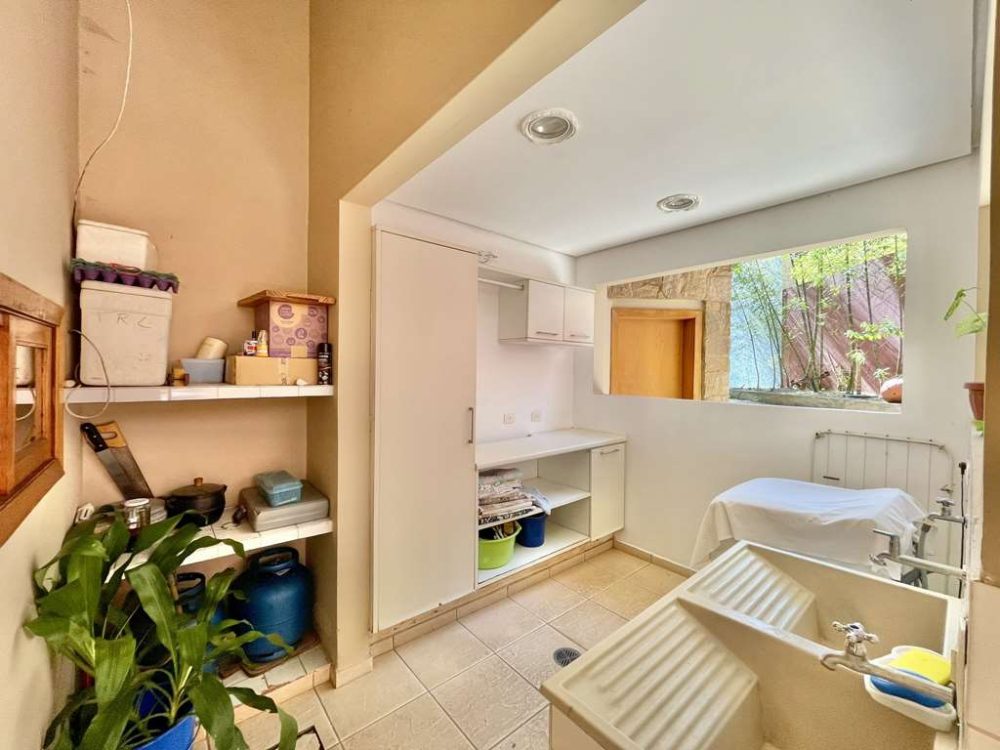 - Área de serviço aberta ensolarada e lavanderia fechada com 2 tanques, armários.
