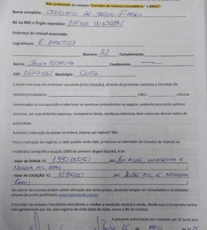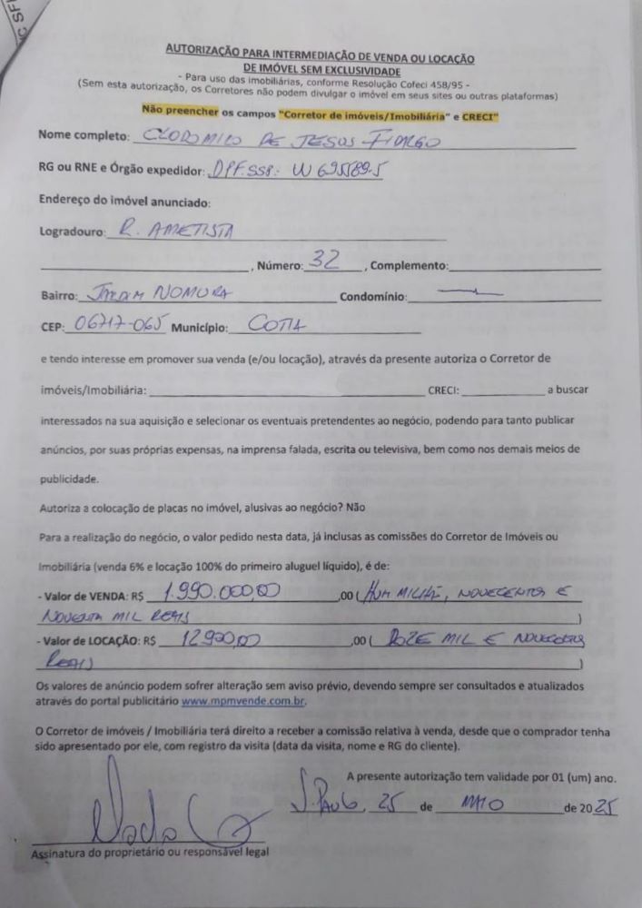 - Endereço do imóvel: Rua Ametista, 32, Jardim Nomura, Cotia, SP – CEP: 06717065
