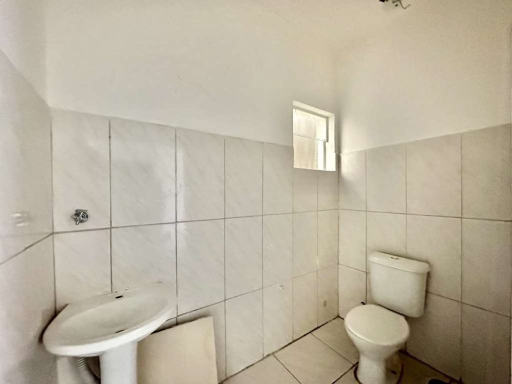 - Banheiro com tampo em travertino e espaço para box e chuveiro elétrico.