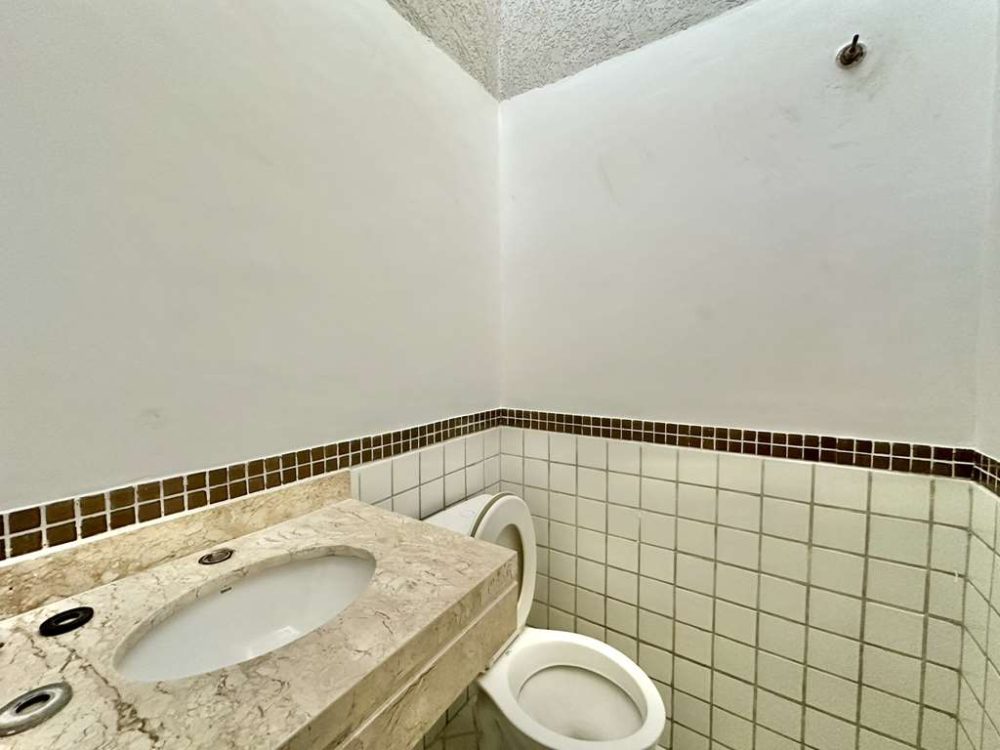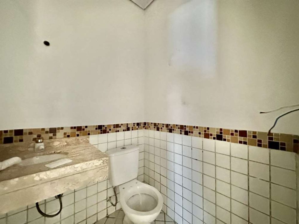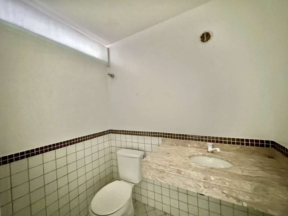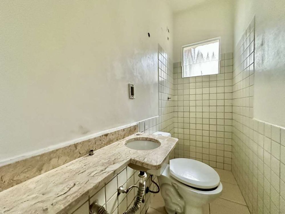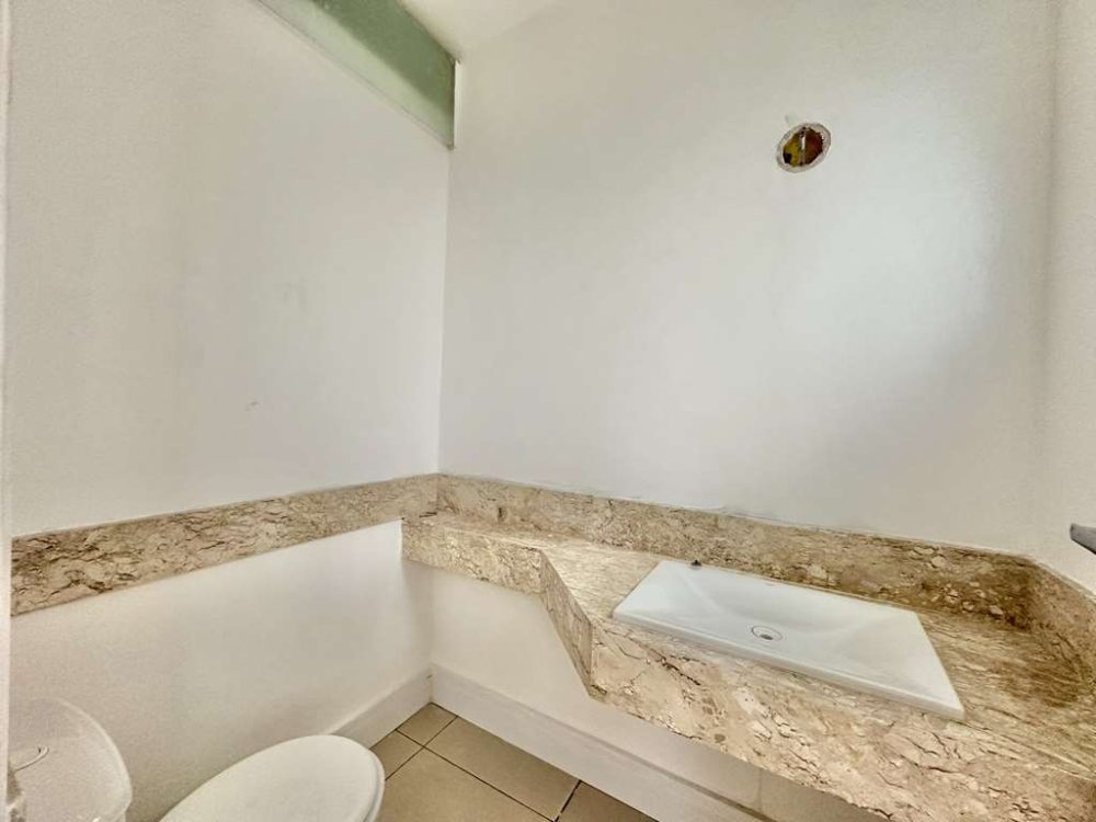 - Lavabo com tampo em mármore e piso em porcelanato.
