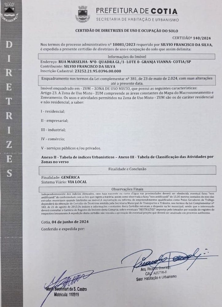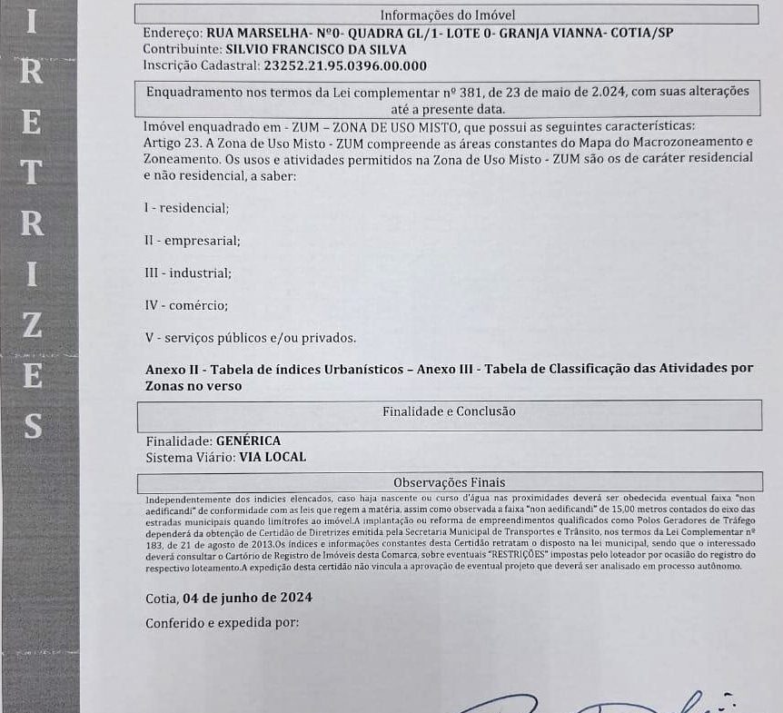 - Certidão de Diretrizes (emitida em 4/Jun/24) disponível no álbum de fotos