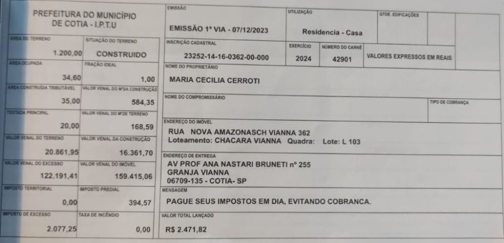 Inscrição Cadastral: 23252.14.16.0362.00.000 / Cotia